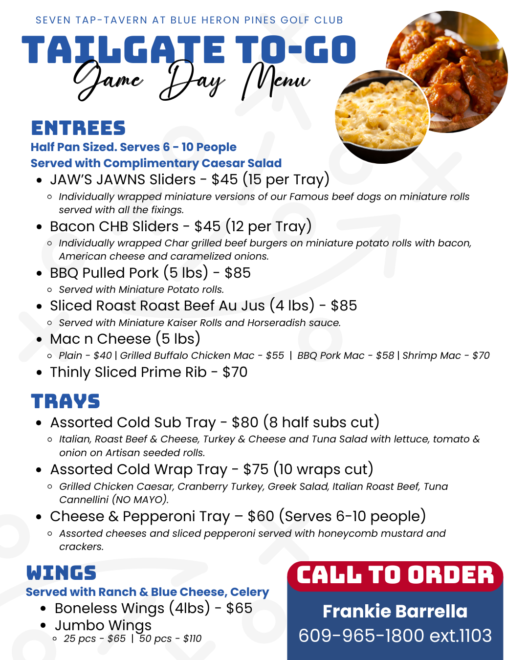 Join us at Blue Heron Pines Golf Club & Seven Tap-Tavern during all NFL games for unbeatable food and drink specials and an electric game day atmosphere.